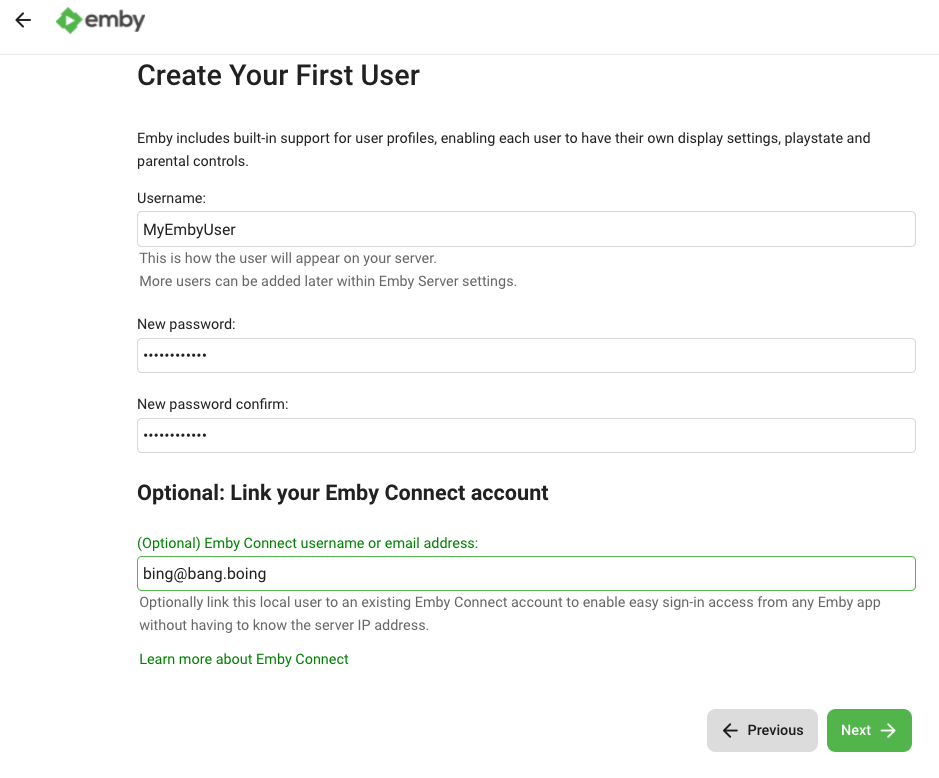 • New Password: A strong password you'll use to log into Emby